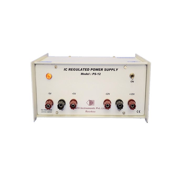 PS-12 is general purpose power supply consists of four independent fixed voltage regulated sources viz. +12 V, -12 V, +5 V and -5 V referred to a common ground. The current rating for each is specified at 300 mA, although it is possible to exceed this limit safely when all four sources are not operating simultaneously. The compact power supply unit is well suited for any general laboratory which uses linear and digital circuits and lC’s. At the same time the excellent performance of the 3- terminal regulators enables the supplies to be used equally satisfactorily for sophisticated inst-rumentation applications. The built-in protection of the regulator in the form of over current and safe area shutdown ensure continued fault free operation of the unit without any maintenance.